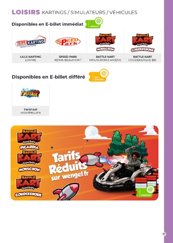 LOISIRS KARTINGS / SIMULATEURS / VÉHICULES Disponibles en E-billet immédiat LILLE KARTING SPEED PARK BATTLE KART BATTLE KART LOMME HÉNIN-BEAUMONT MOUSCRON & AMIENS COUDEKERQUE-BR. Disponibles en E-billet différé TWISTAIR MONTPELLIER 46 47